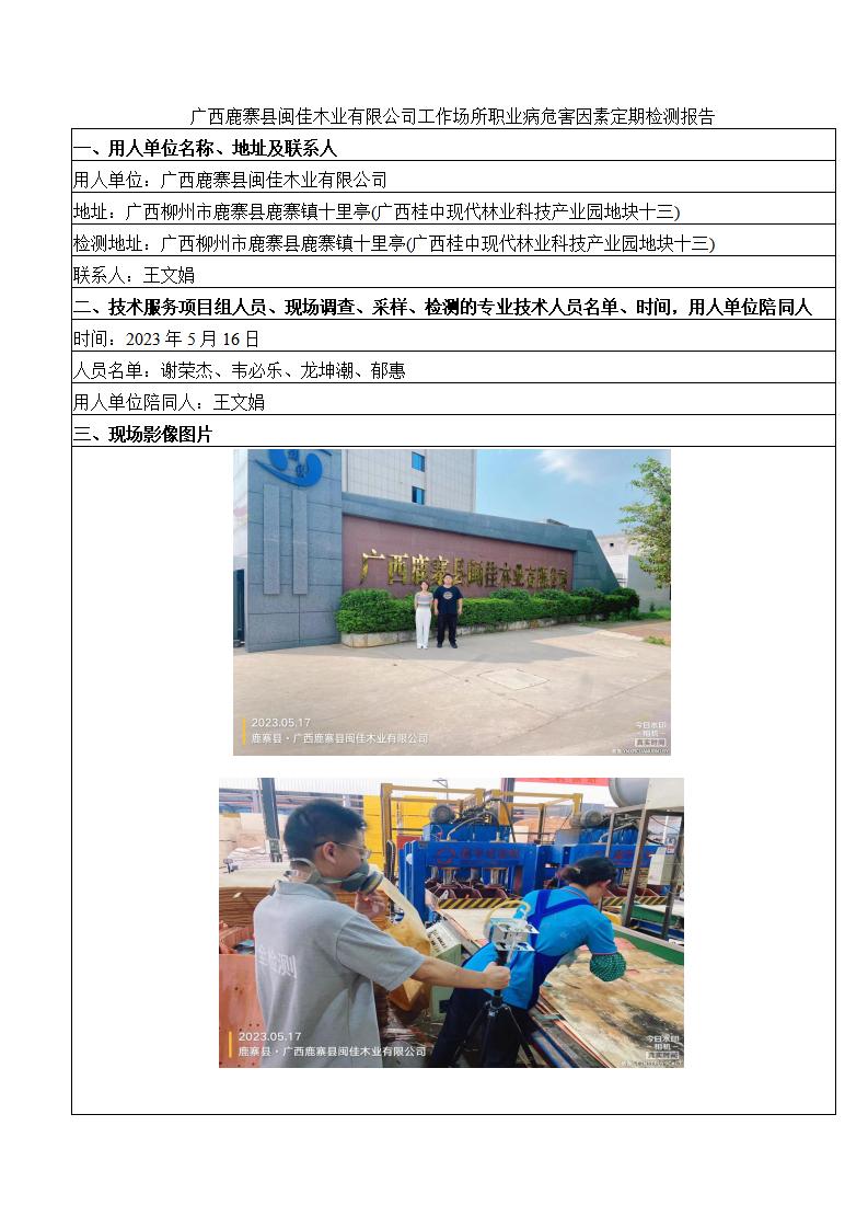廣西鹿寨縣閩佳木業(yè)有限公司工作場所職業(yè)病危害因素定期檢測報告