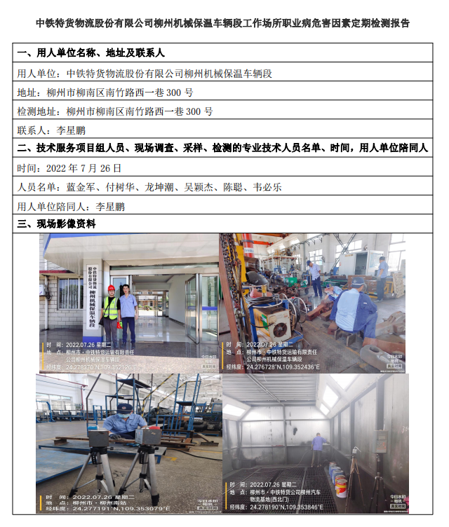 中鐵特貨物流股份有限公司柳州機(jī)械保溫車輛段工作場(chǎng)所職業(yè)病危害因素定期檢測(cè)報(bào)告
