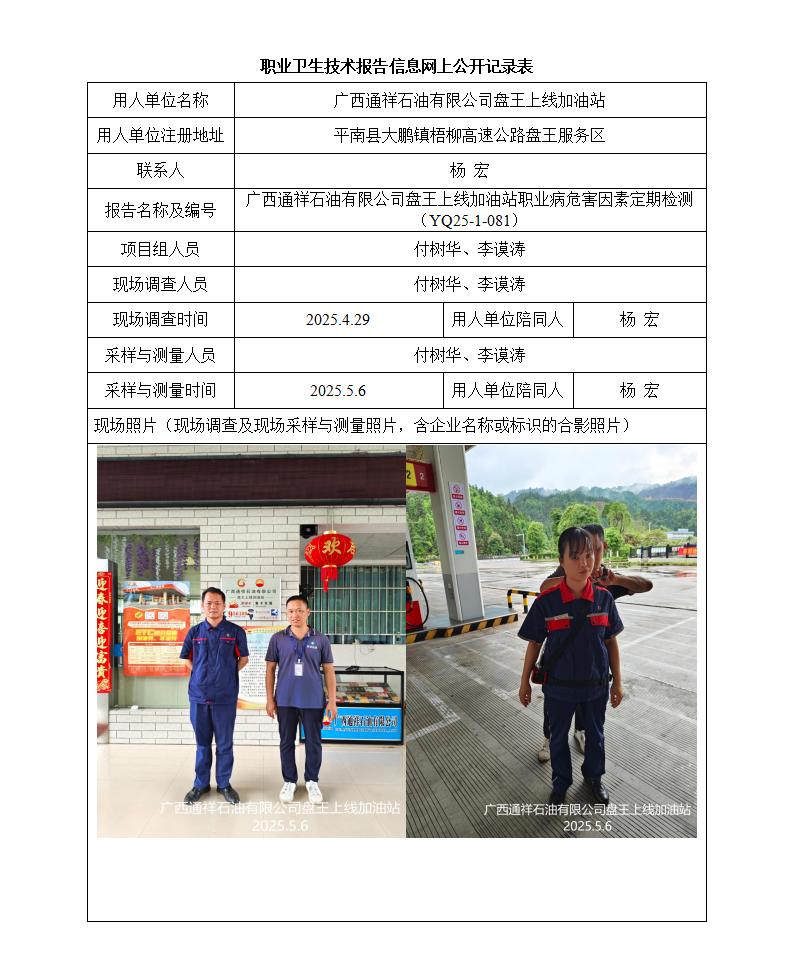廣西通祥石油有限公司盤王上線加油站職業(yè)病危害因素定期檢測
