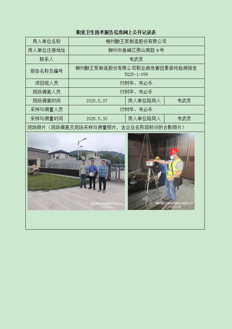 柳州酸王泵制造股份有限公司職業(yè)病危害因素委托檢測(cè)