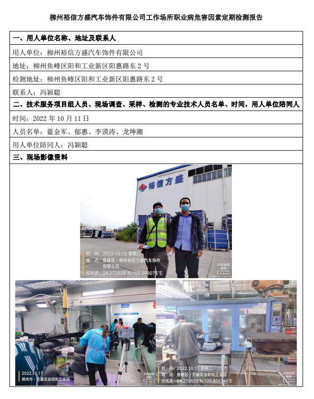 柳州裕信方盛汽車飾件有限公司工作場(chǎng)所職業(yè)病危害因素定期檢測(cè)報(bào)告