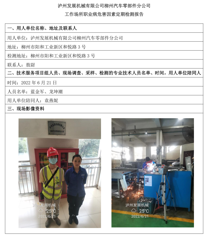 瀘州發(fā)展機(jī)械有限公司柳州汽車零部件分公司工作場所職業(yè)病危害因素定期檢測報(bào)告