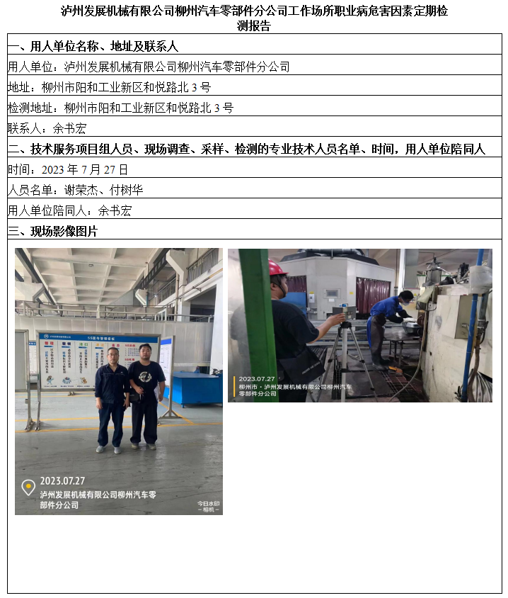 瀘州發(fā)展機(jī)械有限公司柳州汽車零部件分公司工作場(chǎng)所職業(yè)病危害因素定期檢測(cè)報(bào)告