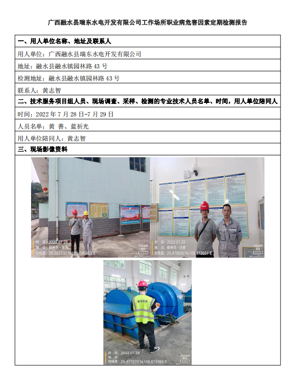 廣西融水縣瑞東水電開發(fā)有限公司工作場所職業(yè)病危害因素定期檢測報告