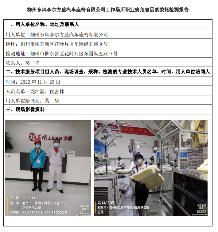 柳州東風(fēng)李爾方盛汽車(chē)座椅有限公司工作場(chǎng)所職業(yè)病危害因素委托檢測(cè)報(bào)告