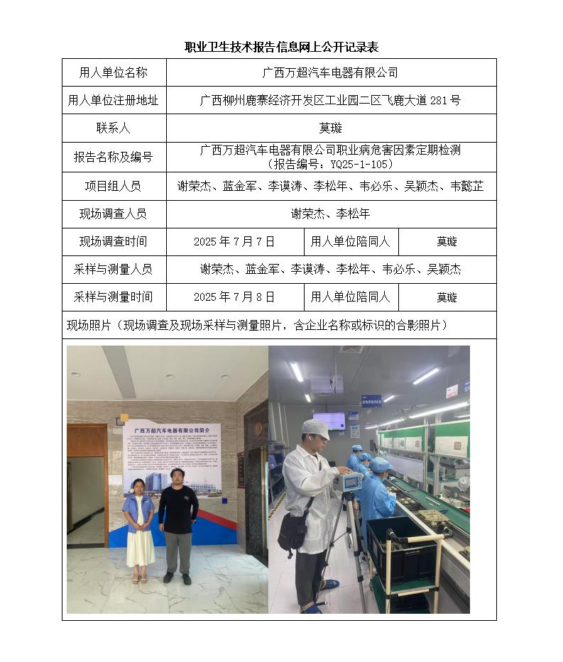 廣西萬超汽車電器有限公司職業(yè)病危害因素定期檢測 (報告編號:YQ25-1-105)