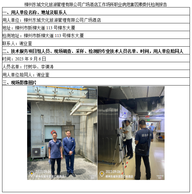 柳州東城文化旅游管理有限公司廣場酒店工作場所職業(yè)病危害因素委托檢測報告