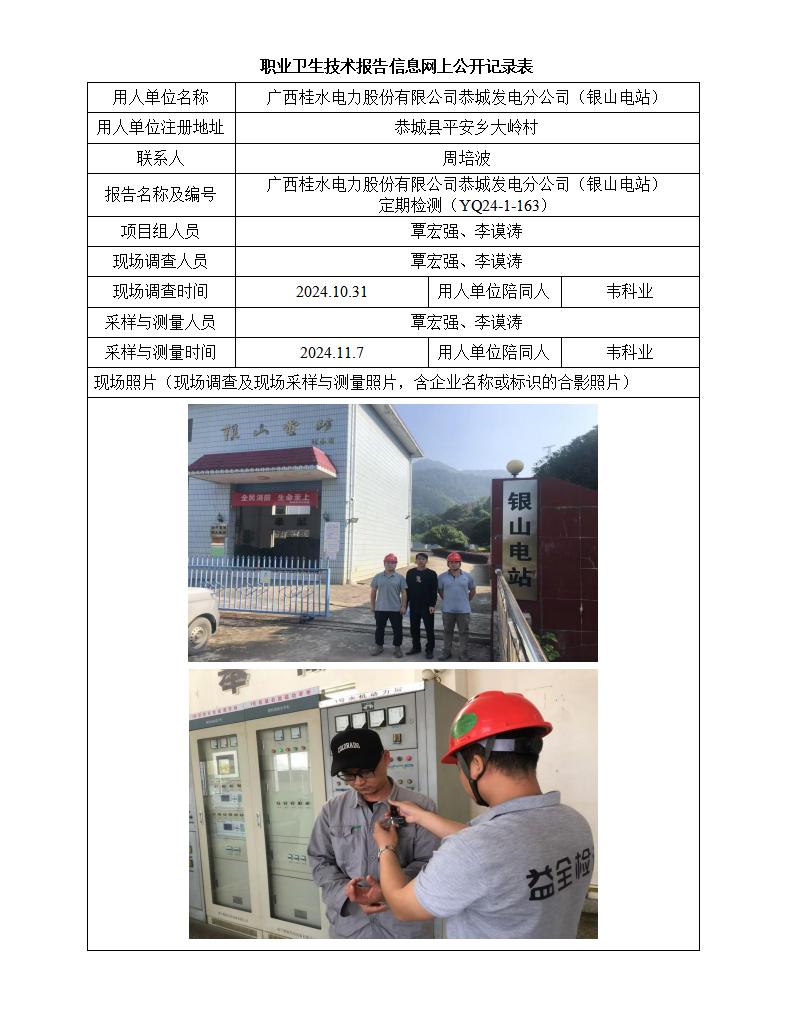 廣西桂水電力股份有限公司恭城發(fā)電分公司(銀山電站)工作場(chǎng)所職業(yè)病危害因素定期檢測(cè)報(bào)告