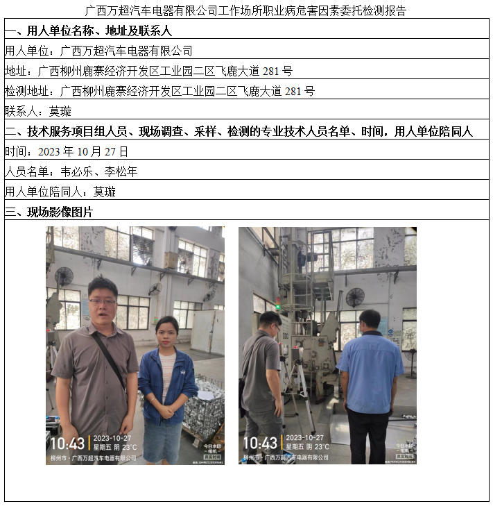 廣西萬超汽車電器有限公司工作場(chǎng)所職業(yè)病危害因素委托檢測(cè)報(bào)告