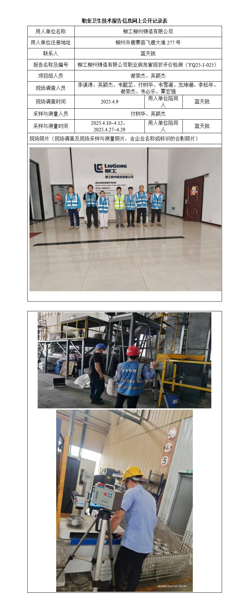 柳工柳州鑄造有限公司職業(yè)病危害現(xiàn)狀評價檢測報告