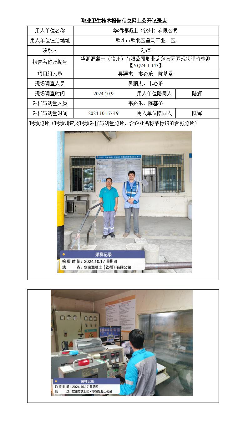 華潤混凝土(欽州)有限公司職業(yè)病危害因素現(xiàn)狀評價檢測報告
