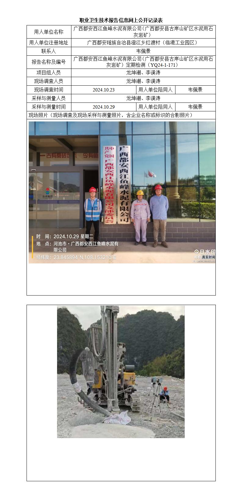 廣西都安西江魚峰水泥有限公司(廣西都安縣古岸山礦區(qū)水泥用石灰?guī)r礦)工作場所職業(yè)病危害因素定期檢測報告