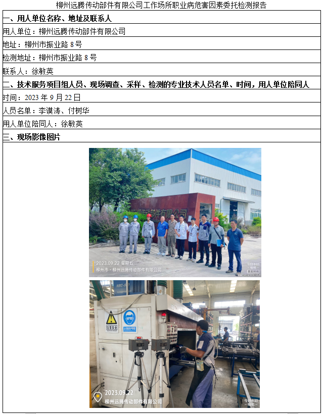 柳州遠(yuǎn)騰傳動部件有限公司工作場所職業(yè)病危害因素委托檢測報告