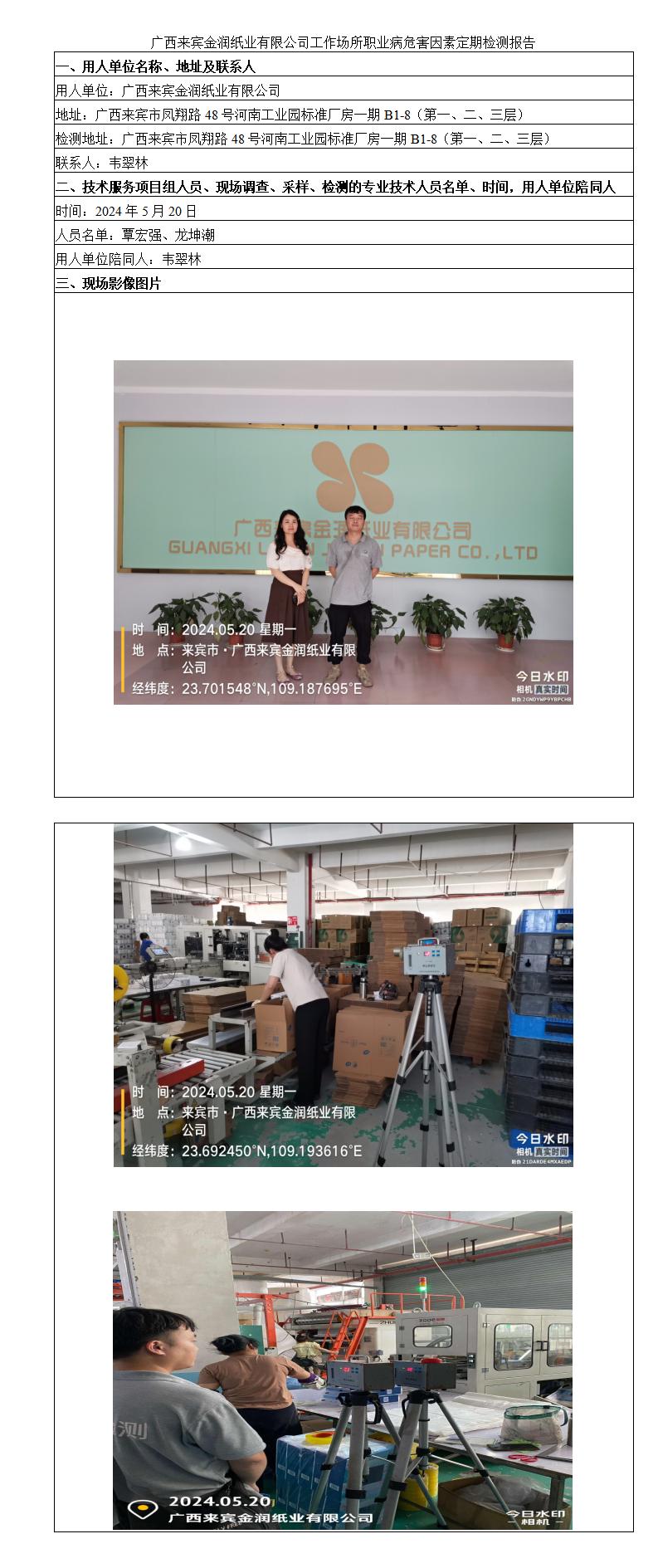 廣西來賓金潤紙業(yè)有限公司工作場所職業(yè)病危害因素定期檢測報告