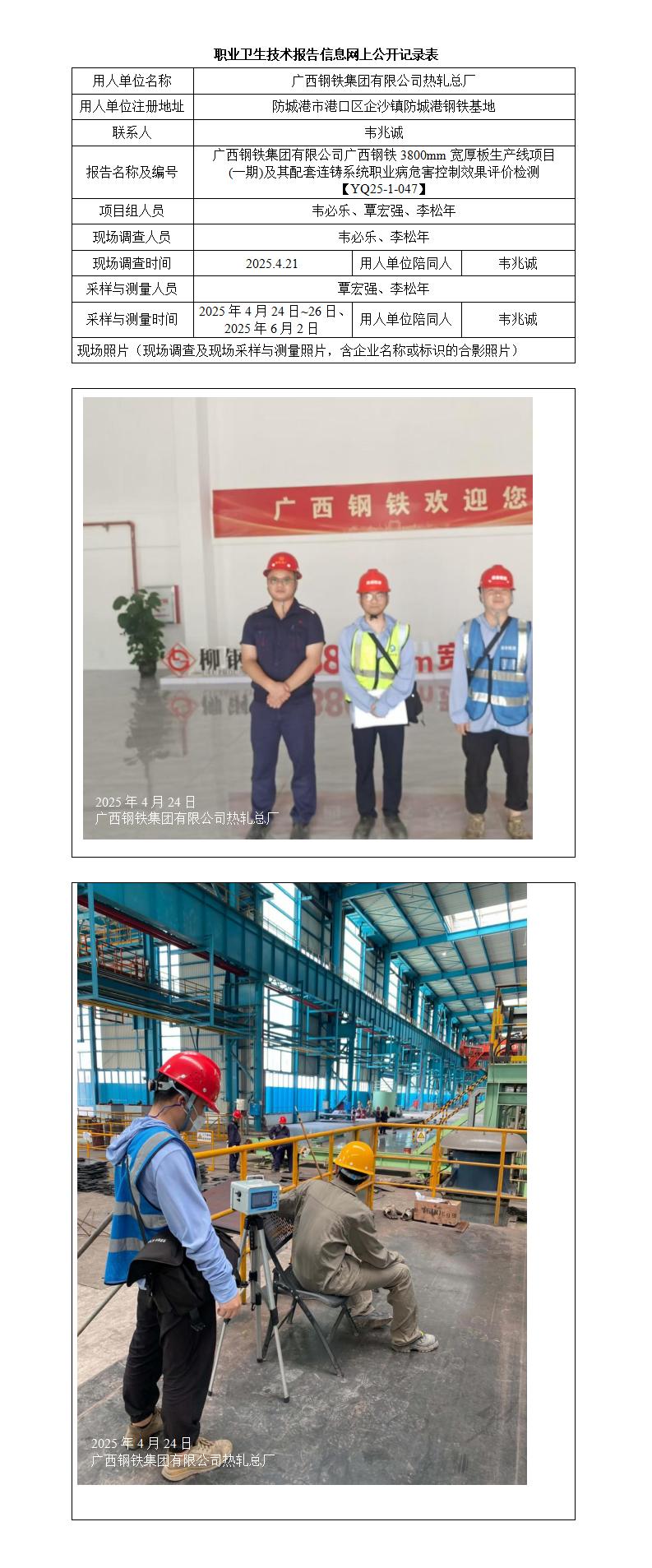 廣西鋼鐵集團有限公司廣西鋼鐵3800mm寬厚板生產線項目 (一期)及其配套連鑄系統(tǒng)職業(yè)病危害控制效果評價檢測報告