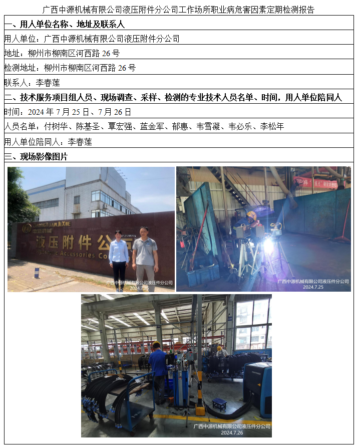 廣西中源機(jī)械有限公司液壓附件分公司工作場(chǎng)所職業(yè)病危害因素定期檢測(cè)報(bào)告
