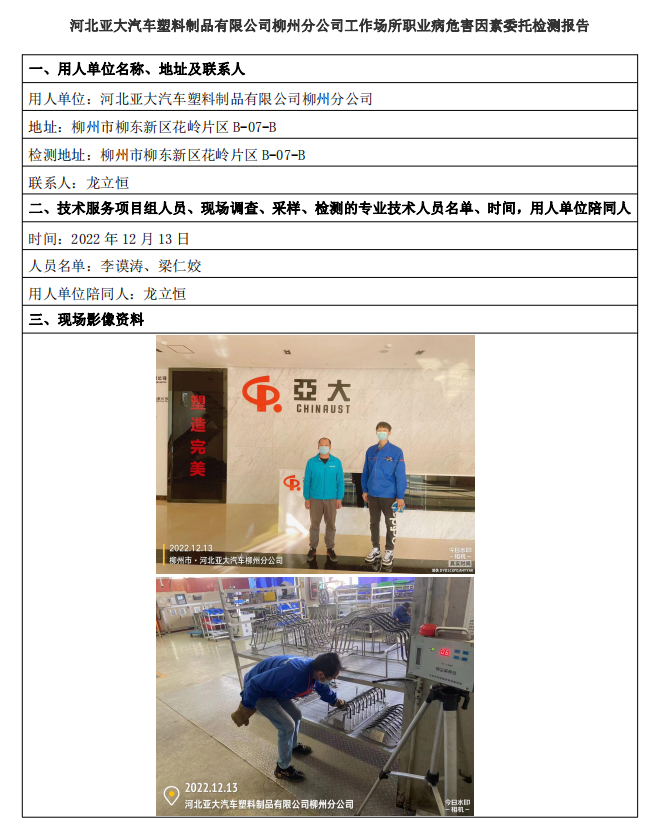 河北亞大汽車塑料制品有限公司柳州分公司工作場(chǎng)所職業(yè)病危害因素委托檢測(cè)報(bào)告
