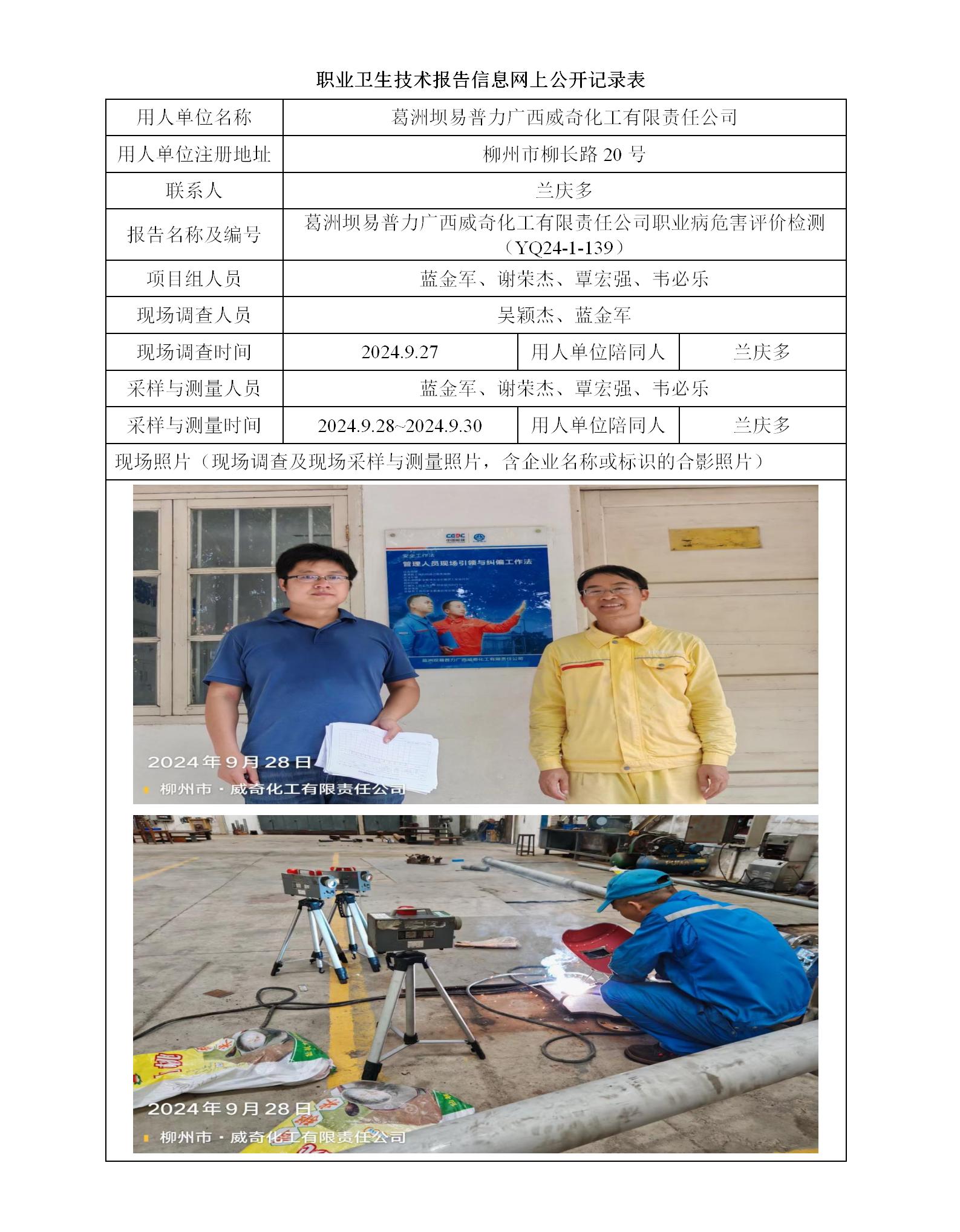 葛洲壩易普力廣西威奇化工有限責(zé)任公司工作場(chǎng)所職業(yè)病危害因素評(píng)價(jià)檢測(cè)報(bào)告