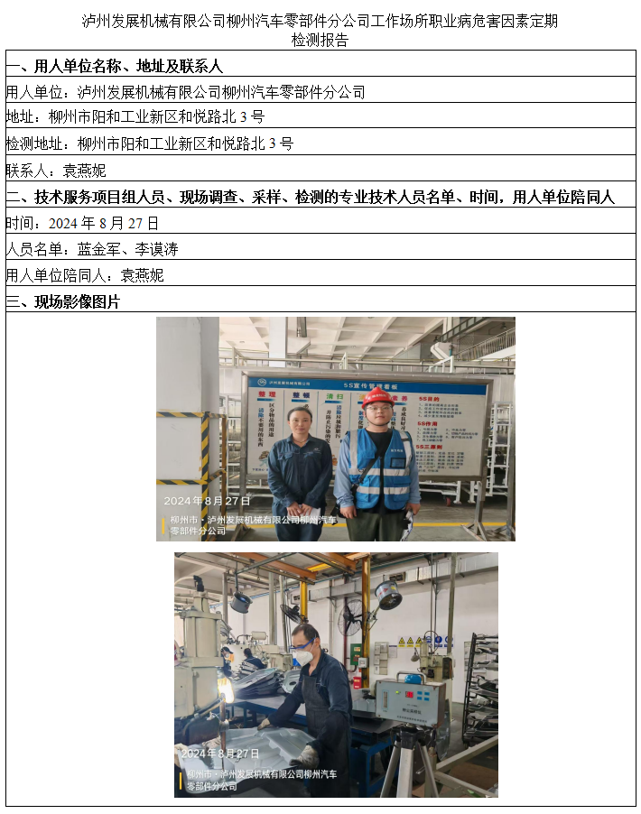 瀘州發(fā)展機械有限公司柳州汽車零部件分公司工作場所職業(yè)病危害因素定期檢測報告