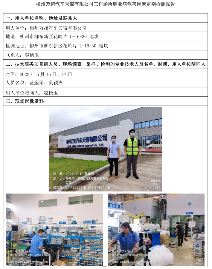 柳州萬超汽車天窗有限公司工作場所職業(yè)病危害因素定期檢測報告
