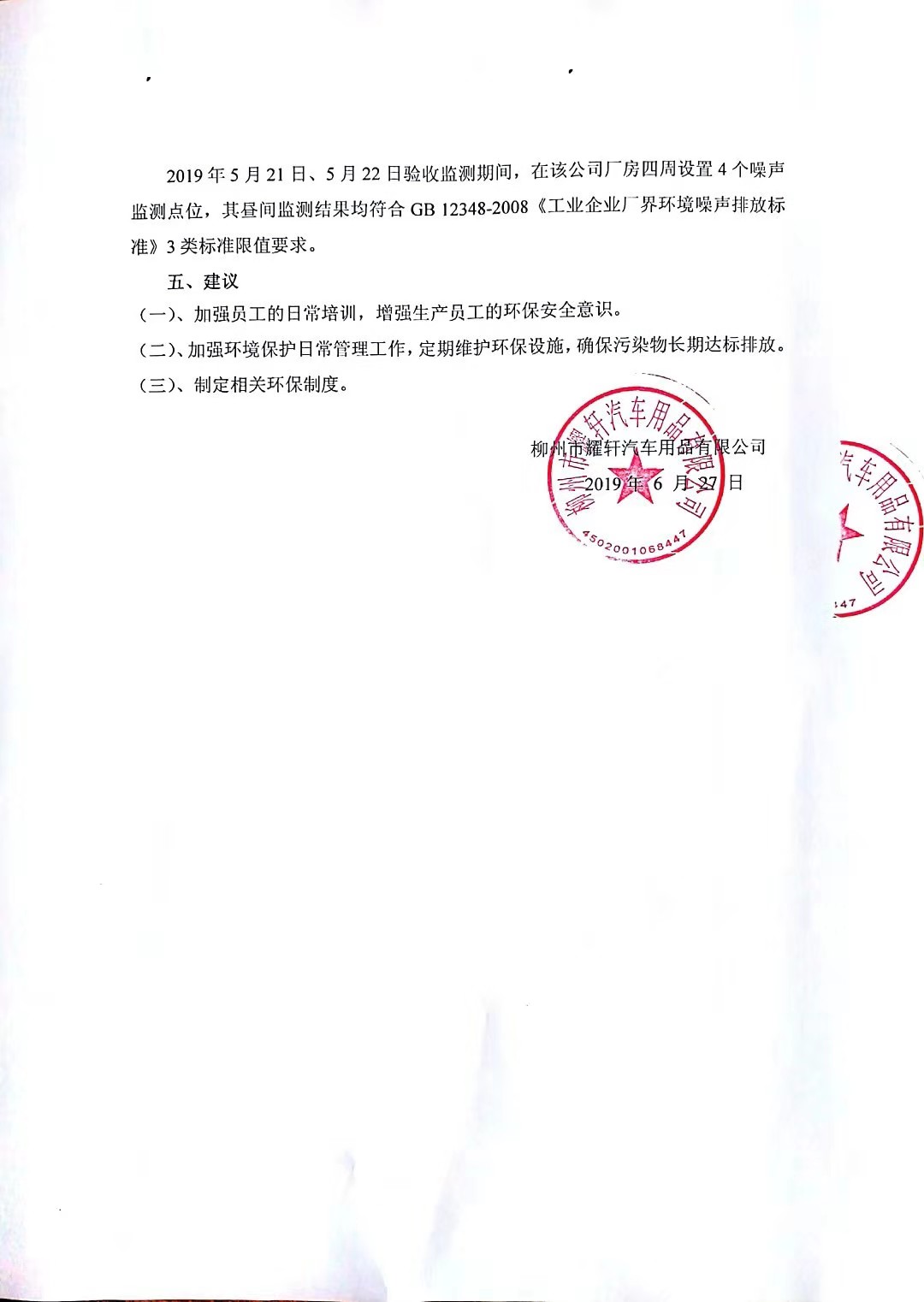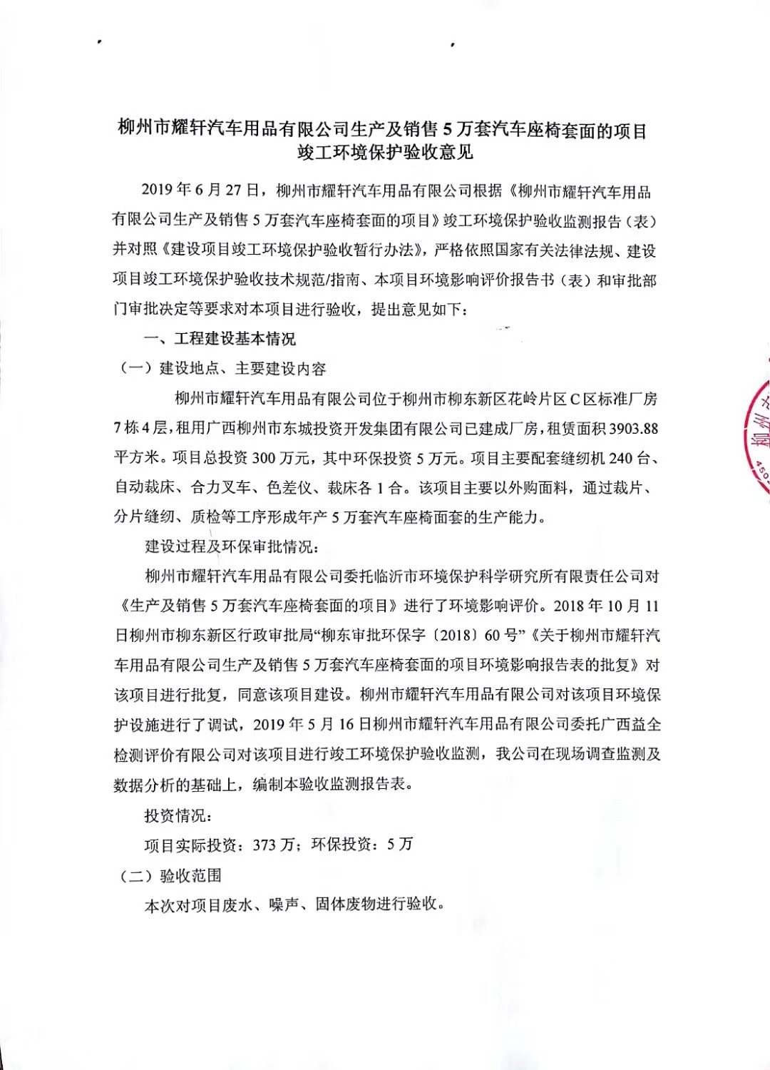 柳州市耀軒汽車用品有限公司生產(chǎn)及銷售5萬套汽車座椅套面的項(xiàng)目驗(yàn)收監(jiān)測報(bào)告表(廢水、噪聲部分)及項(xiàng)目驗(yàn)收意見公示公開